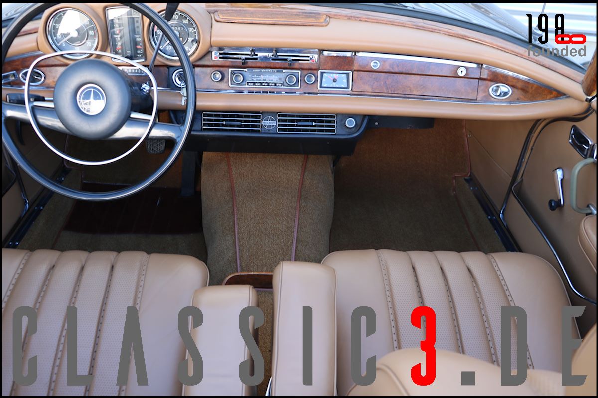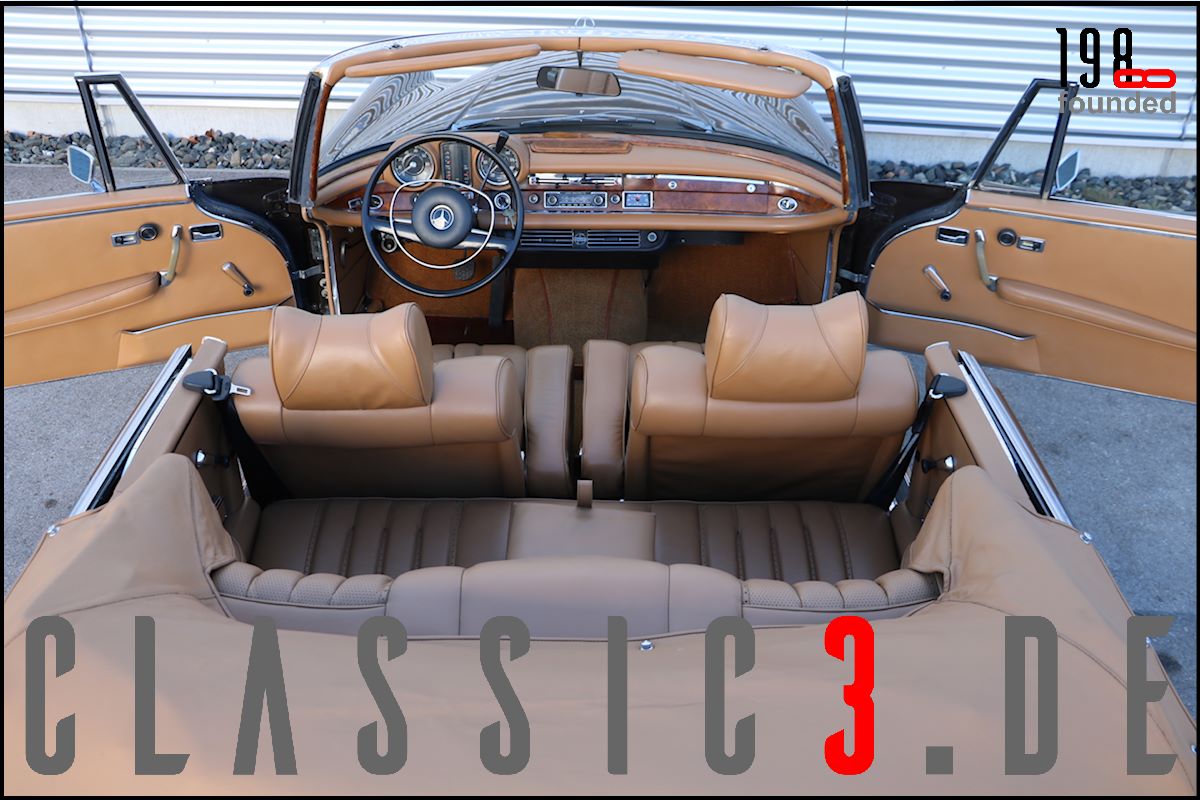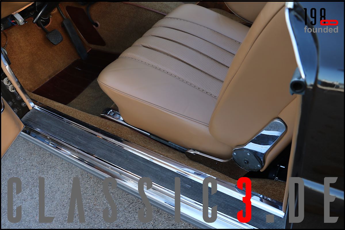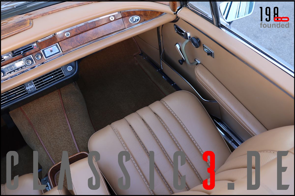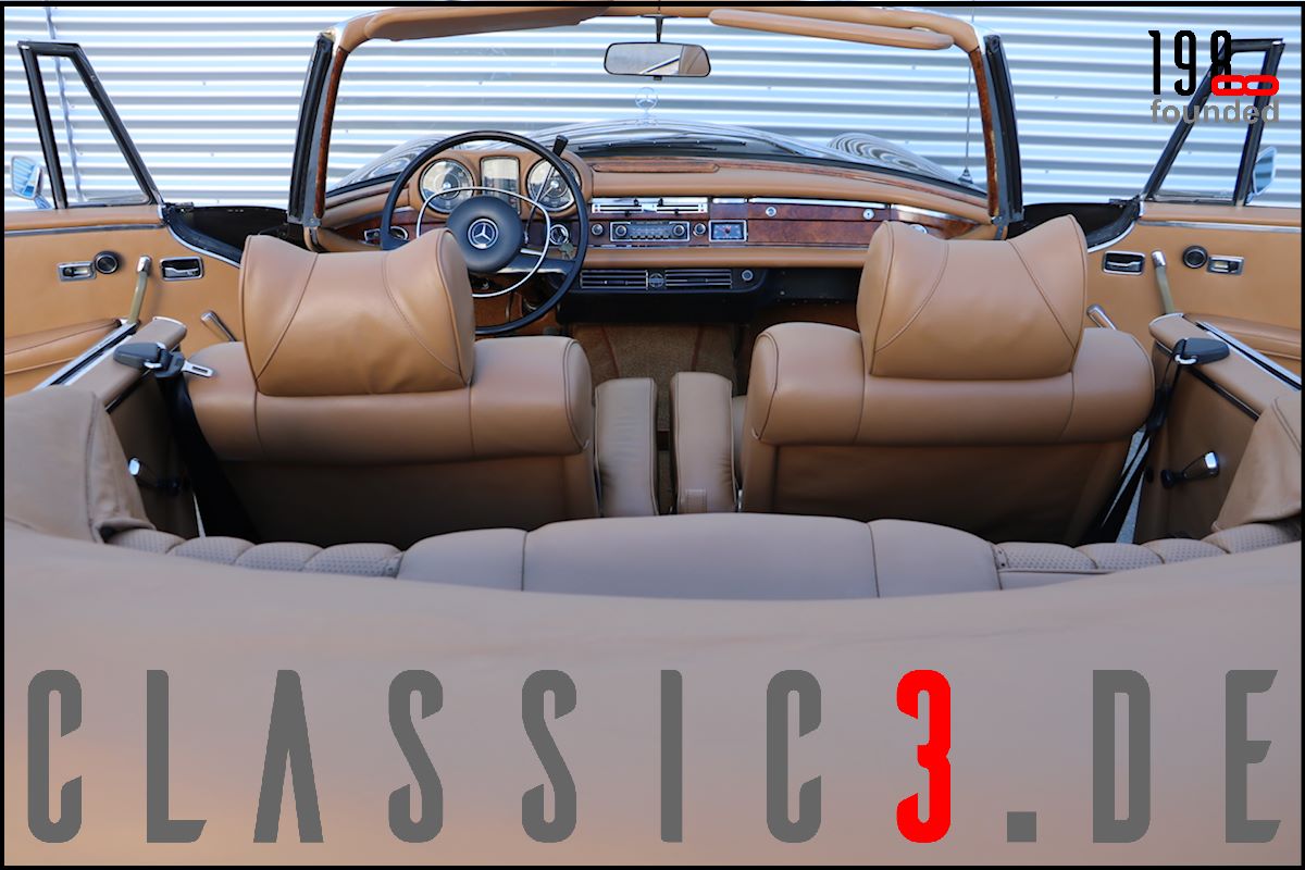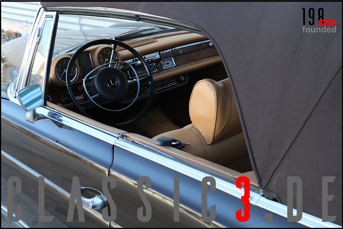 Dieses Mercedes-Benz 280 SE Cabriolet W111 wurde 26.08.1968 bei Mercedes-Benz in Los Angeles mit dem Hinweis bestellt: „Auslieferung in Europa“. Somit nutzte der Besteller die Gunst der Stunde, übernahm sein neues Cabrio in Deutschland und genoss damit eine ausgiebige Europatour, bevor sein Mercedes im Laderaum eines Schiffes und er per Flugzeug die Rückreise über den grossen Teich antraten. Bis 2009 wurde der W111 ausschliesslich in und um Los Angeles bewegt, bevor er wieder deutschen Asphalt unter die Reifen bekam. In der Folge nahm sich ein renommierter Klassik-Fachbetrieb dieser Schönheit an und lieferte sie anschliessend an seinen neuen Besitzer, einen Chef-Arzt in Bayern aus, der akribisch jeden jährlichen Kundendienst incl. Laufleistung aufzeichnete. Aus Zeitmangel verkaufte er das Cabrio 6 Jahre (2015) und 6.500 Km Laufleistung später weiter. Der jetzige Besitzer liess das Cabrio abrüsten und in einem deutschen Meister-Lackierbetrieb komplett in der selben Farbe neu lackieren. Daneben wurden sämtliche Chromteile neu verchromt, die Innenraumteppiche erneuert und die nach wie vor originale, unbeschädigte und sehr schöne Lederinnenausstattung von einem Fachbetrieb gereinigt, aufgearbeitet und versiegelt. Aber auch an der Technik wurde Hand angelegt: So erhielt das Fahrzeug neue Stossdämpfer, die Bremsanlage wurde erneuert, die Einspritzanlage überholt. Was eine echte Seltenheit darstellt: Neben der originalen Bestellung und Rechnung, liegen auch die beiden Datenkarten im Original vor. Aus diesen ist zu ersehen, dass sich dieses 280 SE Cabriolet wie am Tage der Werksauslieferung präsentiert und sowohl der Originalmotor, als auch das Originalgetriebe immer noch verbaut sind (matching numbers). Ein grosser Kundendienst, TÜV neu und eine umfassende Einweisung vor Fahrzeugübergabe verstehen sich von selbst.