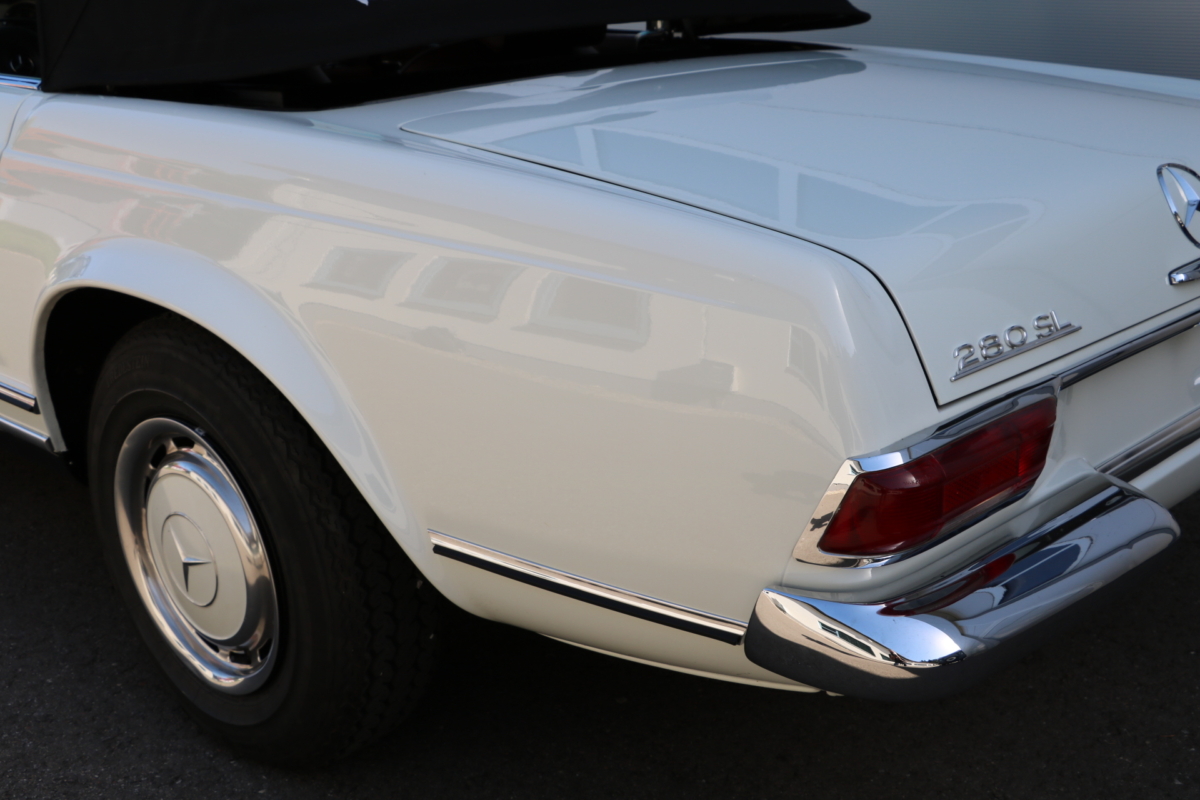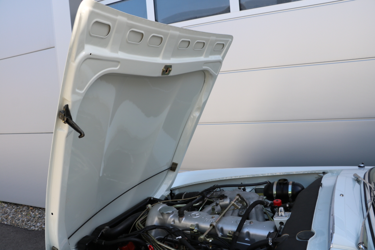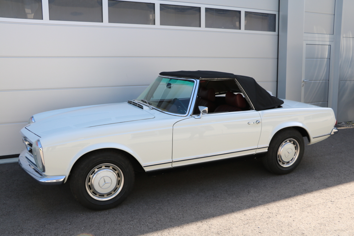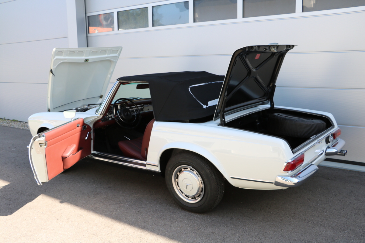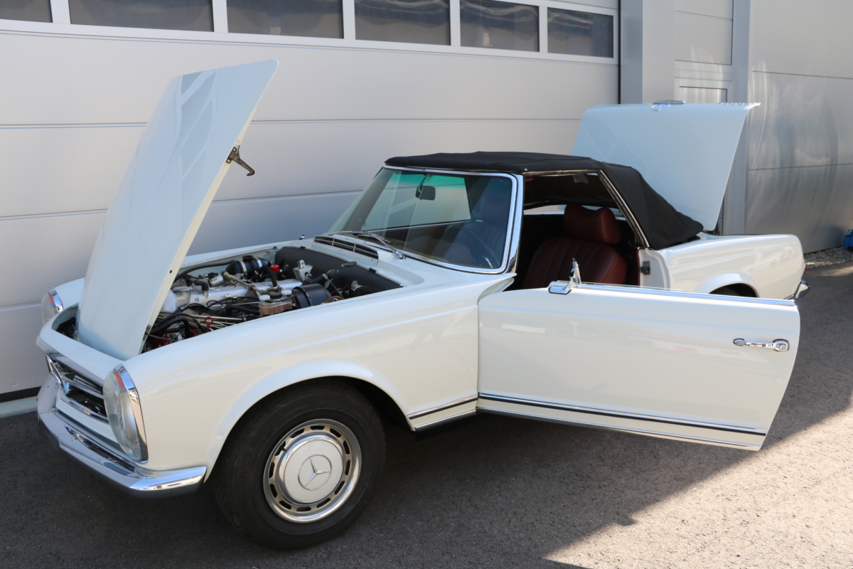 Anlässlich des Genfer Automobilsalons 1963, präsentierte Daimler-Benz den Mercedes-Benz 230 SL mit 150PS / 110kW in 3 Ausführungen: Als offenen Roadster mit sehr leicht bedienbarem Faltverdeck, als die bekannte Cabrio-Version mit Hardtop und zuletzt als Hardtop-Coupe, dem Verdeckkasten und Verdeck fehlten, dafür wurde zusätzlicher Stauraum für Gepäck geschaffen. Auch diese Variante konnte bei Abnahme des Hardtops offen gefahren werden. Als Sonderausstattung war für die Ablage im Fond ein Quersitz erhältlich. Später folgte noch die s.g. "California- Ausführung" mit Fondsitzbank, ebenfalls ohne Verdeck / Verdeckkasten. Ausser dem Viergang-Schaltgetriebe konnte auch erstmals bei einem SL ein Viergang-Automatikgetriebe geordert werden. Ab Mai 1966 stand zusätzlich ein ZF-Fünfgang- Schaltgetriebe gegen Aufpreis zur Verfügung. Dem konkav gewölbten Hardtop verdankt der SL seinen Spitznamen "Pagode". Im Februar 1967 präsentierte Mercedes-Benz den 250SL. Die Änderungen betrafen im Wesentlichen den Motor und die Bremsanlage. Identische Pferdestärken, aber ein Plus an Hubraum und Drehmoment: + 190 cm³ /+20 Nm, was sich sehr positiv auf den Laufkomfort auswirkte. Nach 5.196 gebauten 250 SL, präsentierte Mercedes-Benz 1968 den 280 SL: 170Ps / 125kW, 240 Nm. 23.885 Pagoden mit dem 2,8 Liter Motor wurden gebaut und eine davon, präsentiert sich hier, aufwändig, fachkundig und detailgetreu restauriert und mit CLASSIC DATA GUTACHTEN, Note 1!