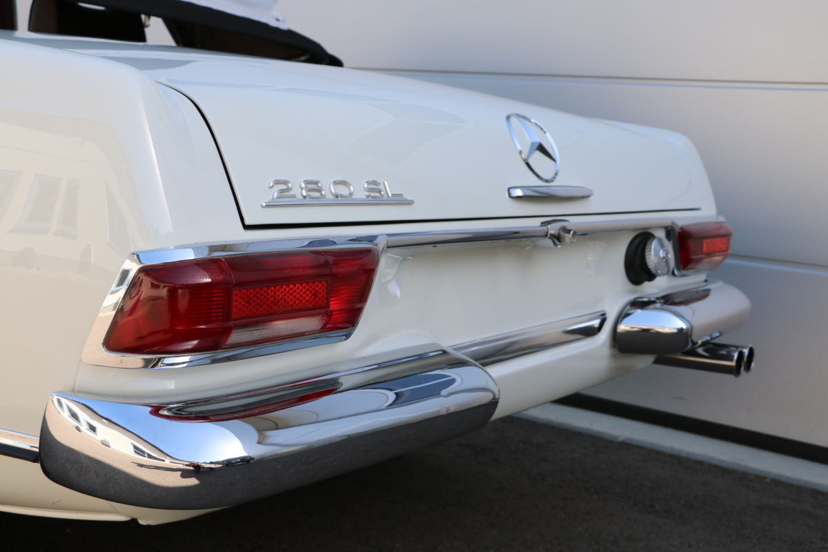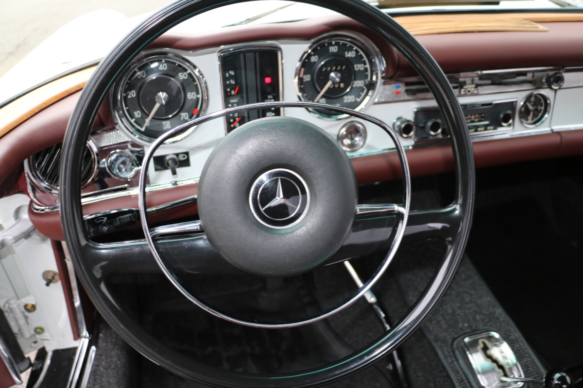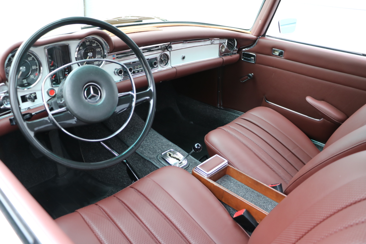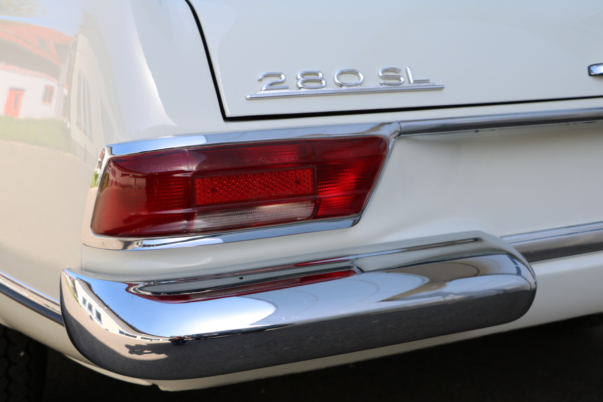Anlässlich des Genfer Automobilsalons 1963, präsentierte Daimler-Benz den Mercedes-Benz 230 SL mit 150PS / 110kW in 3 Ausführungen: Als offenen Roadster mit sehr leicht bedienbarem Faltverdeck, als die bekannte Cabrio-Version mit Hardtop und zuletzt als Hardtop-Coupe, dem Verdeckkasten und Verdeck fehlten, dafür wurde zusätzlicher Stauraum für Gepäck geschaffen. Auch diese Variante konnte bei Abnahme des Hardtops offen gefahren werden. Als Sonderausstattung war für die Ablage im Fond ein Quersitz erhältlich. Später folgte noch die s.g. "California- Ausführung" mit Fondsitzbank, ebenfalls ohne Verdeck / Verdeckkasten. Ausser dem Viergang-Schaltgetriebe konnte auch erstmals bei einem SL ein Viergang-Automatikgetriebe geordert werden. Ab Mai 1966 stand zusätzlich ein ZF-Fünfgang- Schaltgetriebe gegen Aufpreis zur Verfügung. Dem konkav gewölbten Hardtop verdankt der SL seinen Spitznamen "Pagode". Im Februar 1967 präsentierte Mercedes-Benz den 250SL. Die Änderungen betrafen im Wesentlichen den Motor und die Bremsanlage. Identische Pferdestärken, aber ein Plus an Hubraum und Drehmoment: + 190 cm³ /+20 Nm, was sich sehr positiv auf den Laufkomfort auswirkte. Nach 5.196 gebauten 250 SL, präsentierte Mercedes-Benz 1968 den 280 SL: 170Ps / 125kW, 240 Nm. 23.885 Pagoden mit dem 2,8 Liter Motor wurden gebaut und eine davon, präsentiert sich hier, aufwändig, fachkundig und detailgetreu restauriert und mit CLASSIC DATA GUTACHTEN, Note 1!
