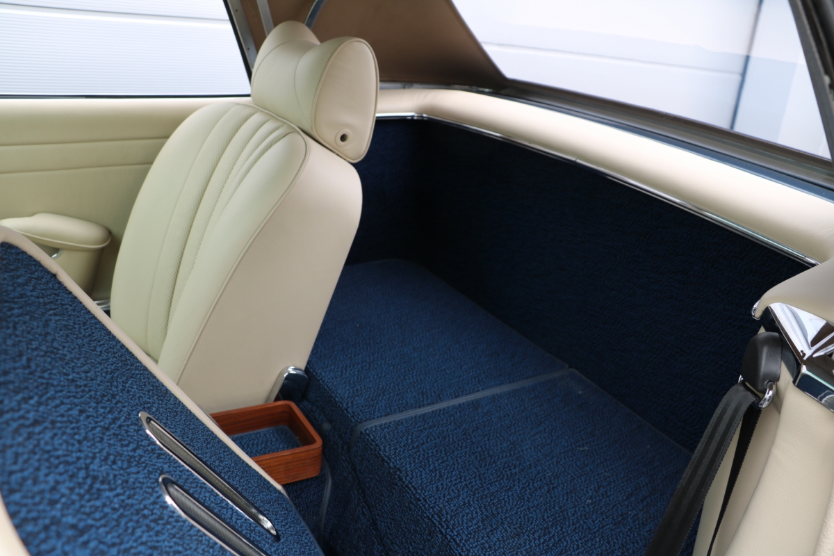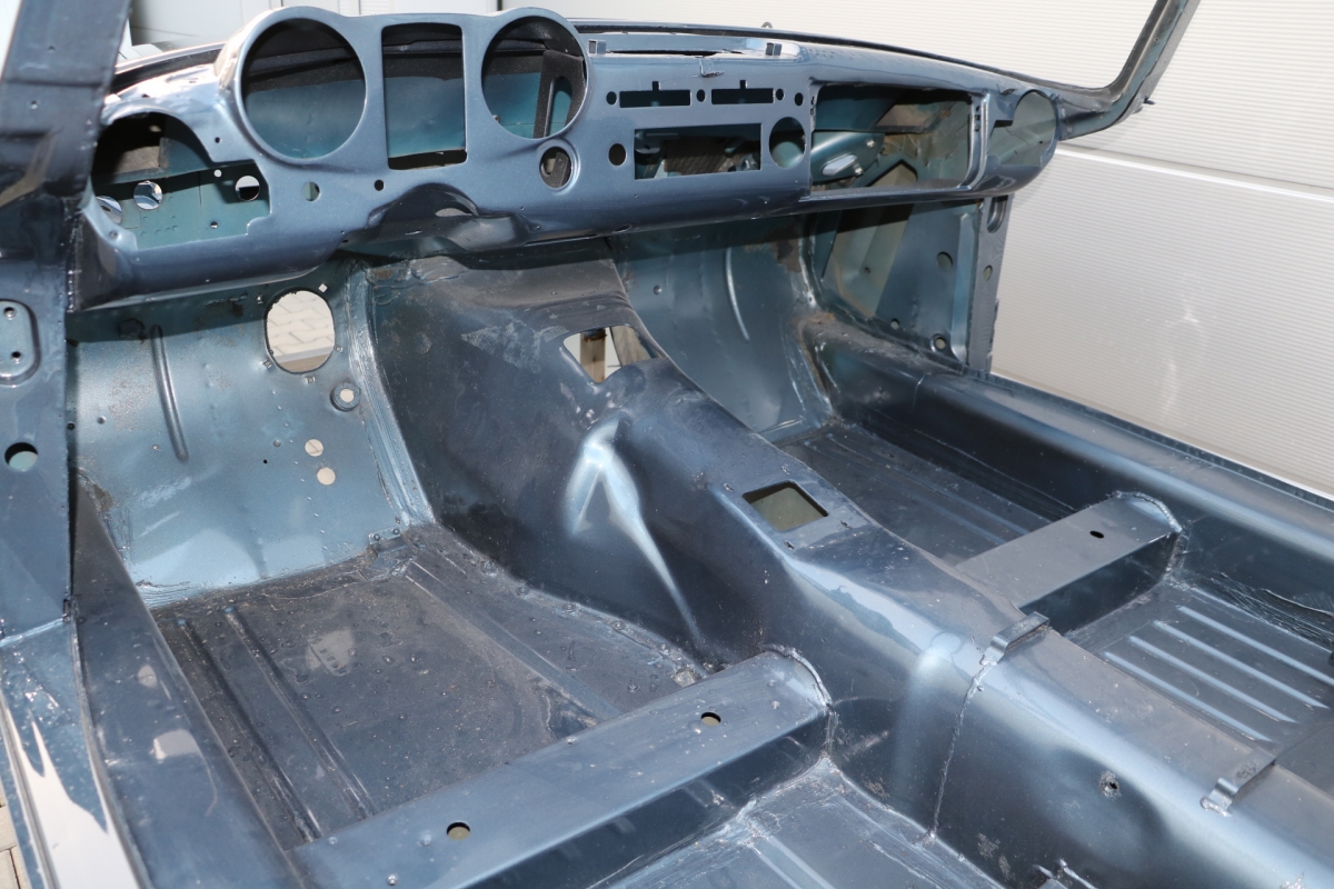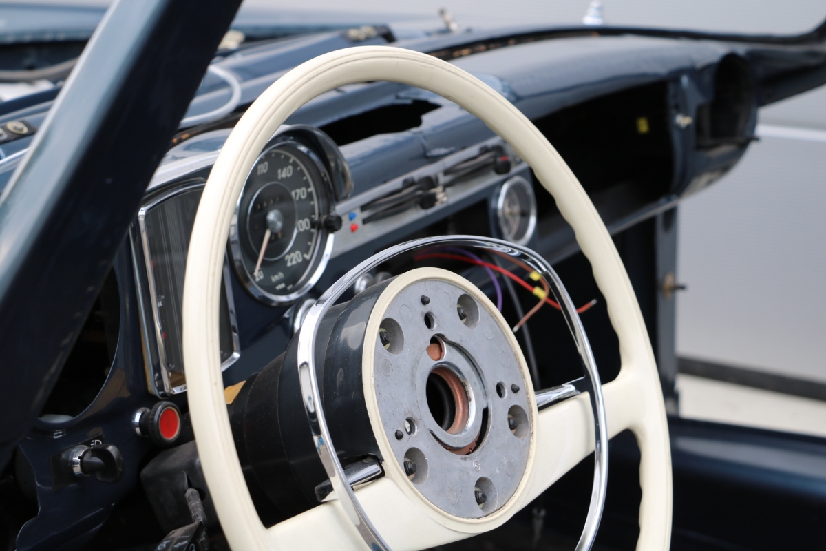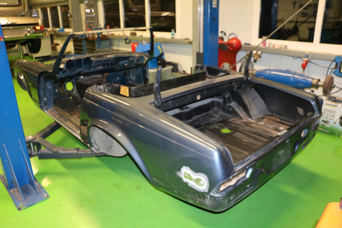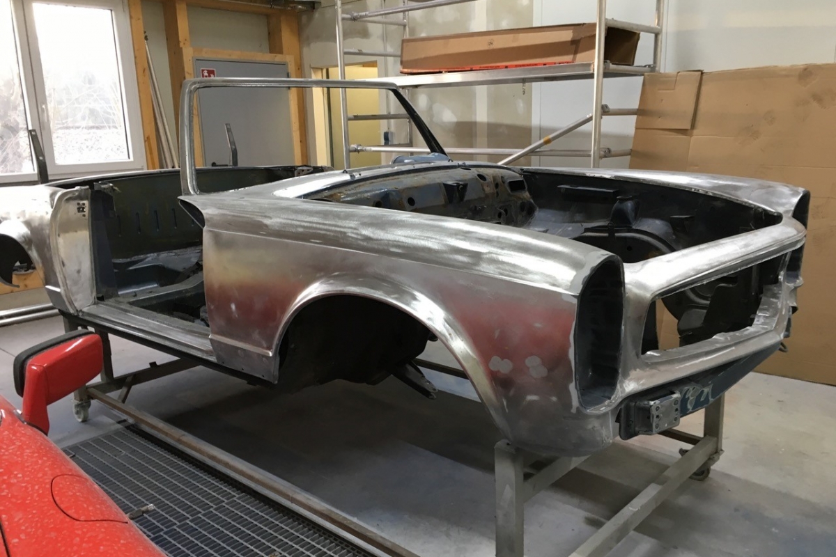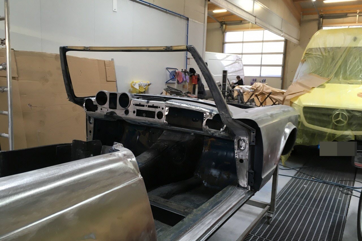 Wir haben schon viele Pagoden wiederbelebt, jede war auf ihre Weise besonders, aber bei dieser wird das s.g.i-Tüpferl mitgeliefert. Zum einen war sie bis dato die teuerste Restaurationsgrundlage in unserer Firmengeschichte da in einem völlig unbeschädigten, unfallfreien, unberührten und rostfreien Originalzustand. Lediglich die Innenausstattung wurde irgendwann die letzten 48 Jahre ausgewechselt. Aber die Original-Farbkombination in der diese Pagode 1969 ausgeliefert wurde, dürfte von einer Dame gewählt worden sein: Sehr mondän und exclusiv: Dunkelblau, wie schon auf den Photos erkennbar, mit Leder PERGAMENT. Schliessen Sie die Augen und stellen sich die fertiggestellte Pagode am Hafen von Monaco vor, im Hintergrund die weissen Yachten.... Bis dahin war es ein langer Weg, während dessen wir die Fertigstellung laufend photographisch dokumentiert haben. Ausschliesslich alle Neuteile wurden über Mercedes-Classic geordert. Fahrgestell-, Motor-, Getriebe- und die am Fahrzeug verbauten Aluminiumteile-Nummern stimmen mit der Datenkarte überein (matching).