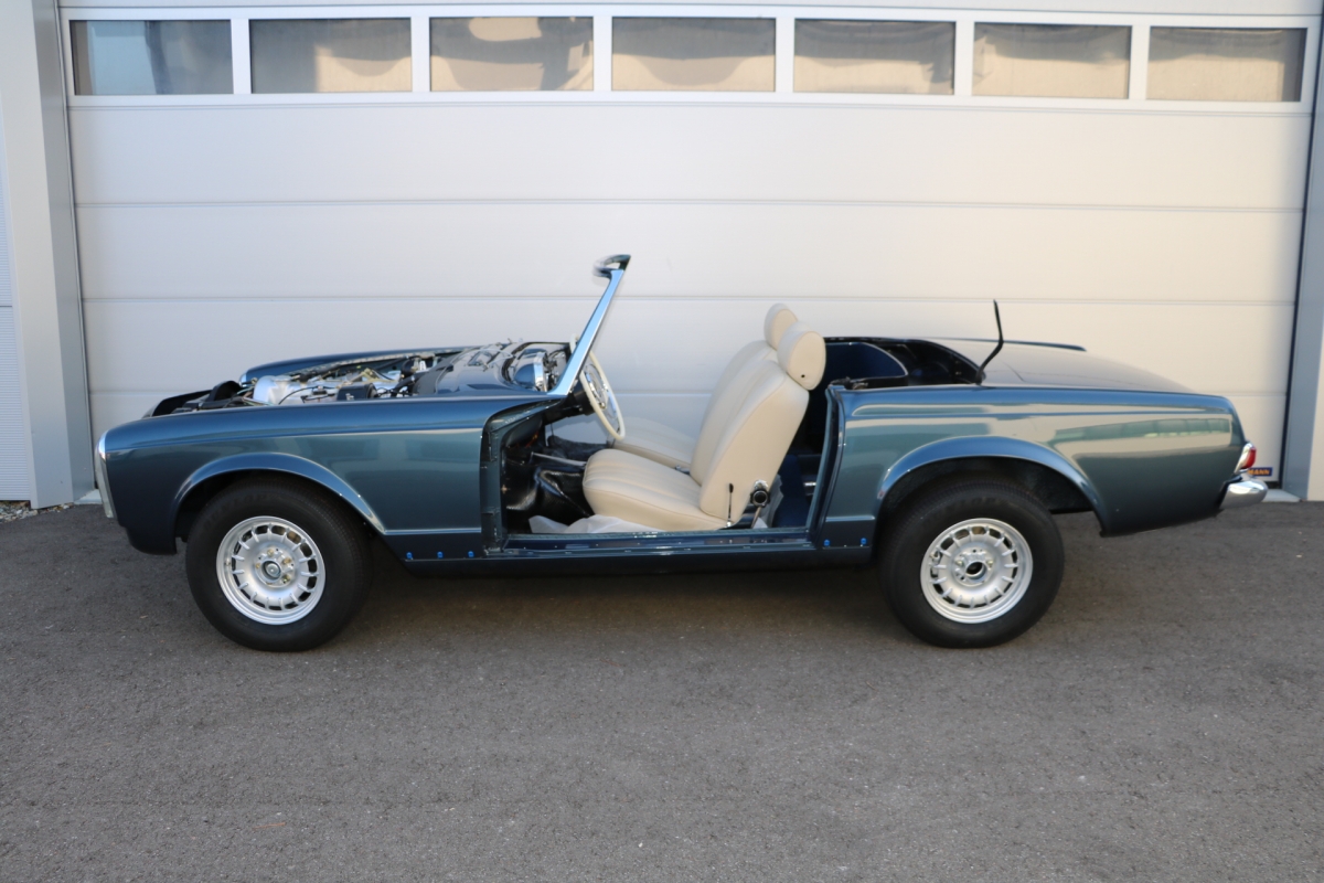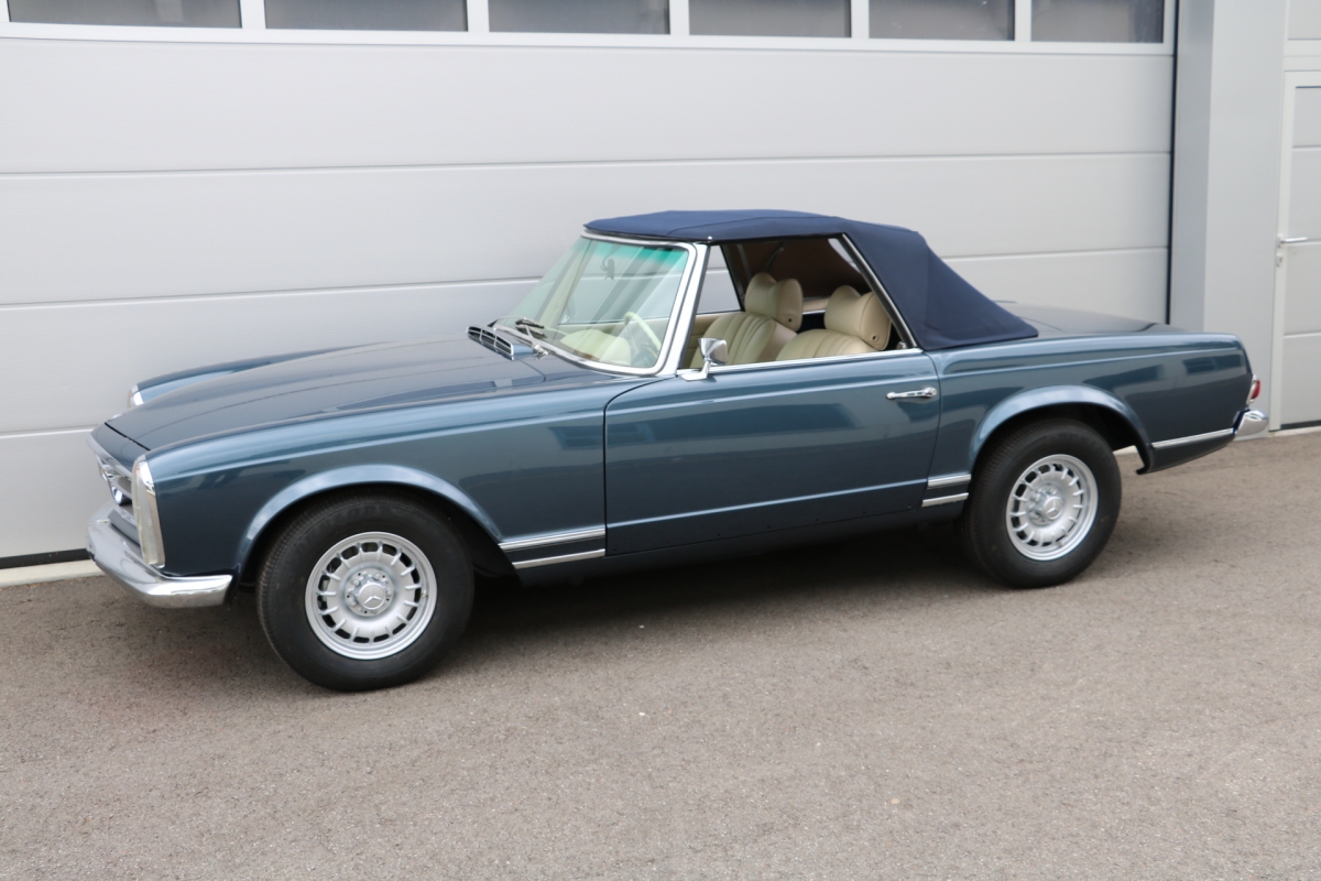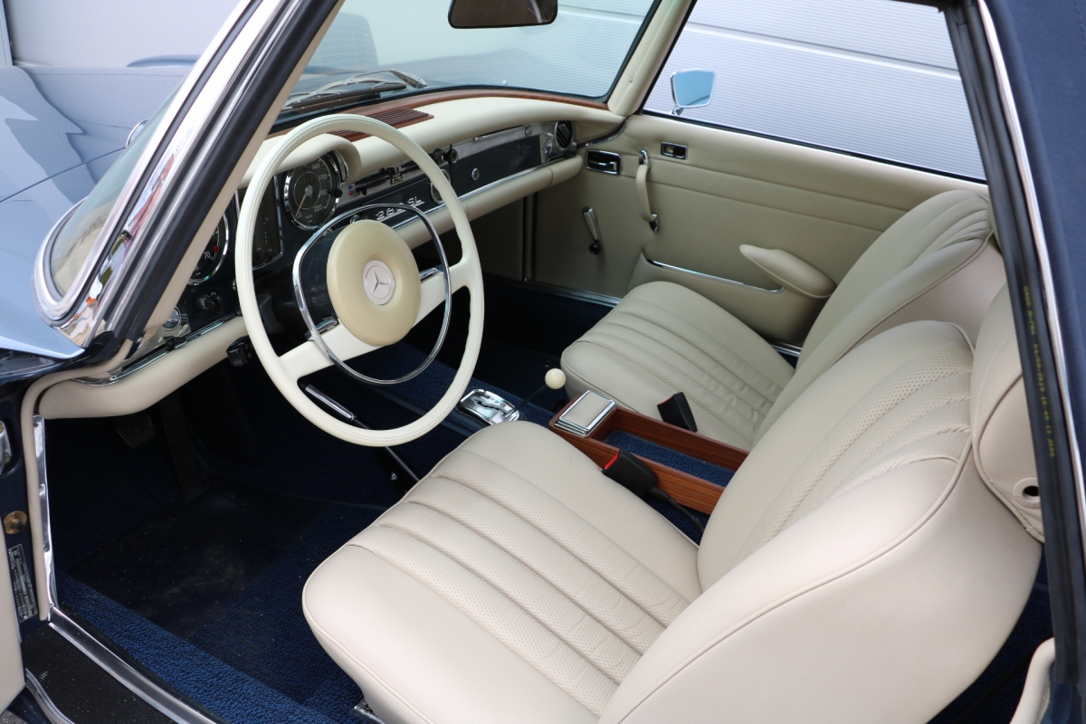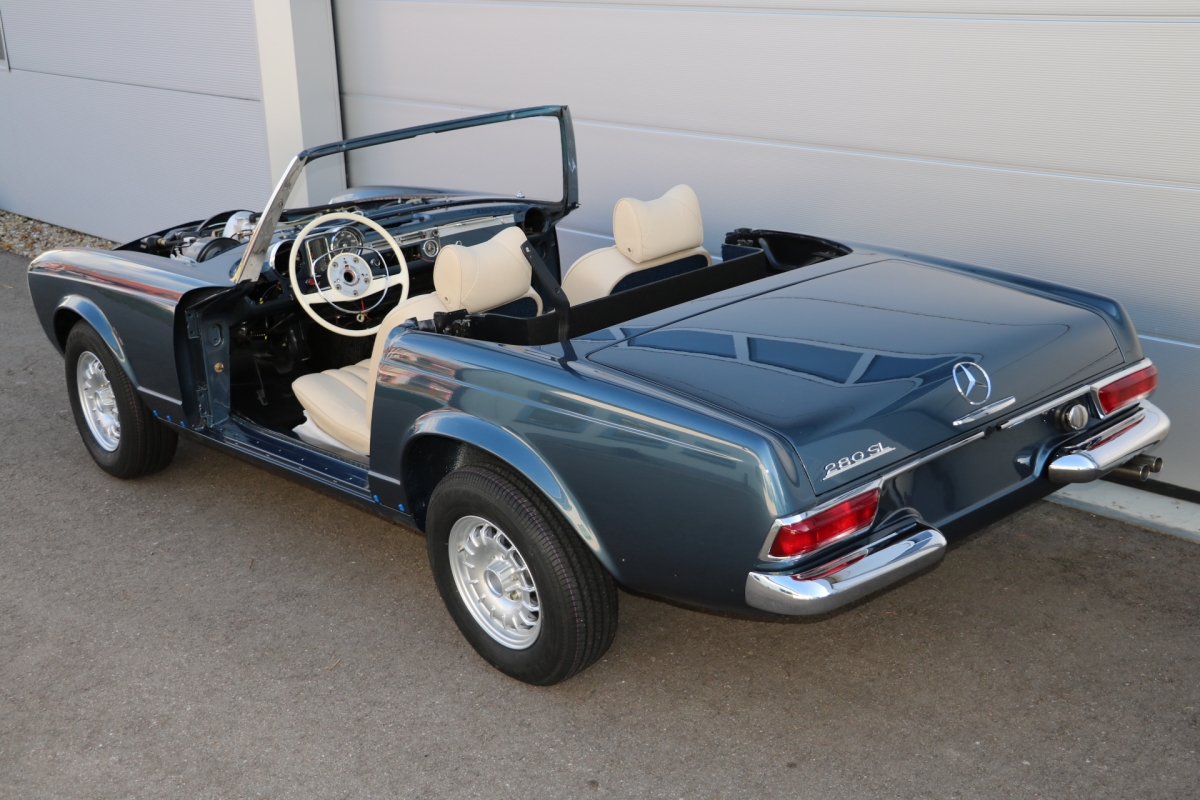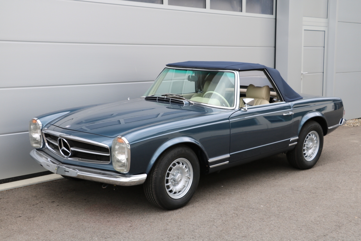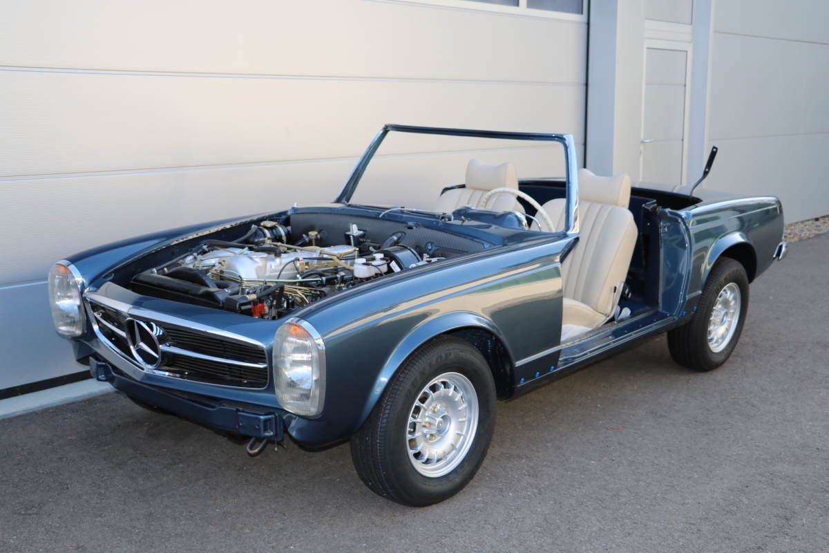 Anlässlich des Genfer Automobilsalons 1963, präsentierte Daimler-Benz den Mercedes-Benz 230 SL mit 150PS / 110kW in 3 Ausführungen: Als offenen Roadster mit sehr leicht bedienbarem Faltverdeck, als die bekannte Cabrio-Version mit Hardtop und zuletzt als Hardtop-Coupe, dem Verdeckkasten und Verdeck fehlten, dafür wurde zusätzlicher Stauraum für Gepäck geschaffen. Auch diese Variante konnte bei Abnahme des Hardtops offen gefahren werden. Als Sonderausstattung war für die Ablage im Fond ein Quersitz erhältlich. Später folgte noch die s.g. "California- Ausführung" mit Fondsitzbank, ebenfalls ohne Verdeck / Verdeckkasten. Ausser dem Viergang-Schaltgetriebe konnte auch erstmals bei einem SL ein Viergang-Automatikgetriebe geordert werden. Ab Mai 1966 stand zusätzlich ein ZF-Fünfgang- Schaltgetriebe gegen Aufpreis zur Verfügung. Dem konkav gewölbten Hardtop verdankt der SL seinen Spitznamen "Pagode". Im Februar 1967 präsentierte Mercedes-Benz den 250SL. Die Änderungen betrafen im Wesentlichen den Motor und die Bremsanlage. Identische Pferdestärken, aber ein Plus an Hubraum und Drehmoment: + 190 cm³ /+20 Nm, was sich sehr positiv auf den Laufkomfort auswirkte. Nach 5.196 gebauten 250 SL, präsentierte Mercedes-Benz 1968 den 280 SL: 170Ps / 125kW, 240 Nm. 23.885 Pagoden mit dem 2,8 Liter Motor wurden gebaut und eine davon, präsentiert sich hier, aufwändig, fachkundig und detailgetreu restauriert und mit CLASSIC DATA GUTACHTEN, Note 1!