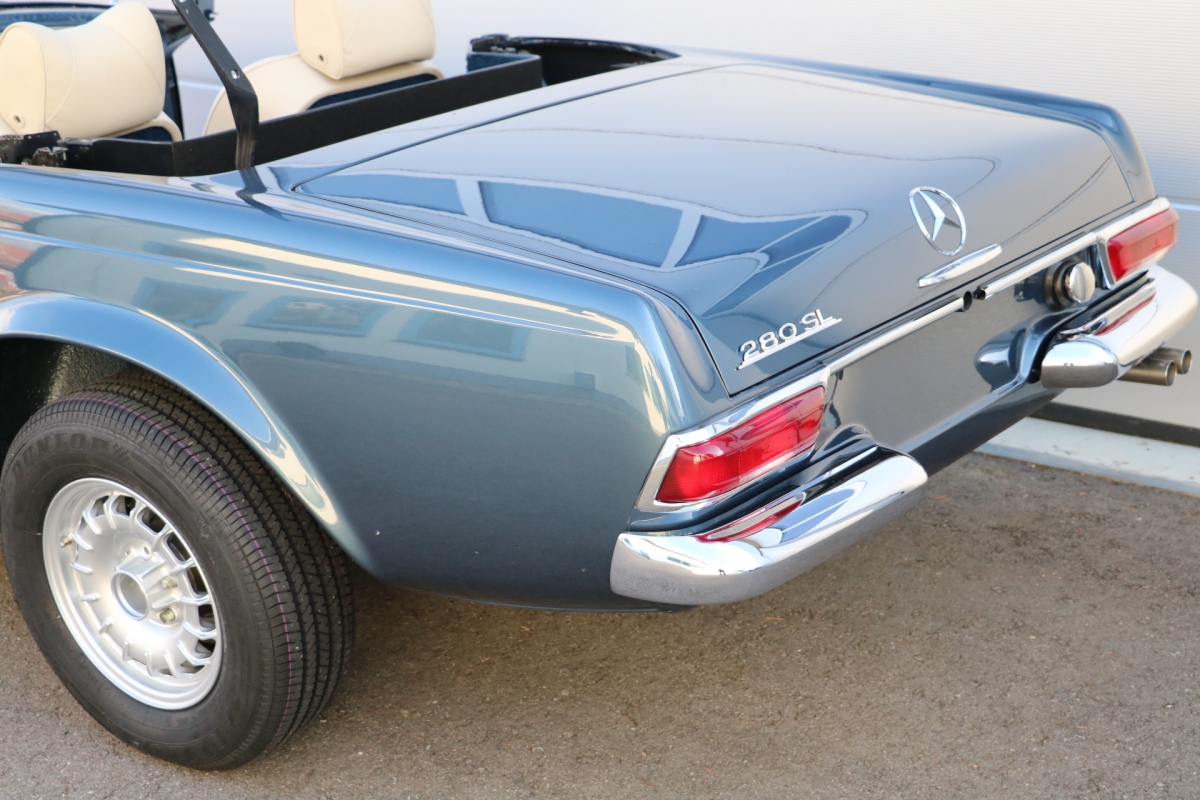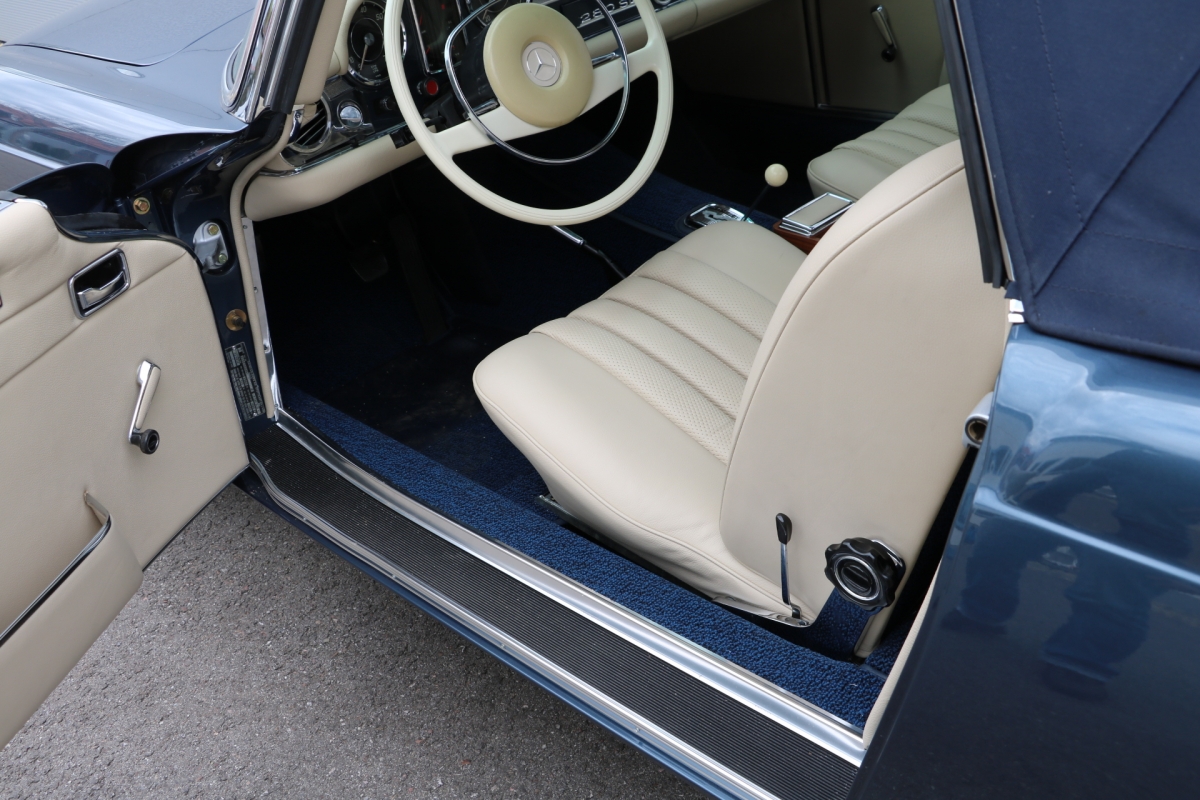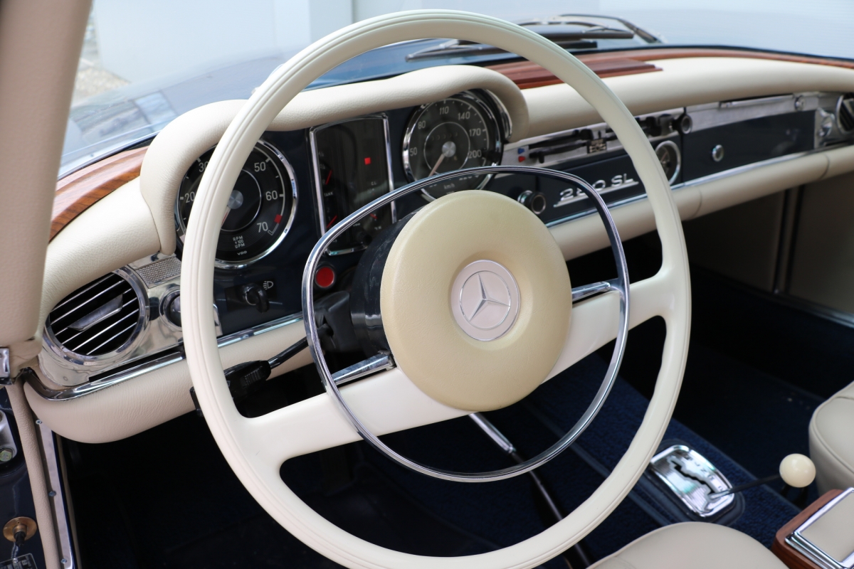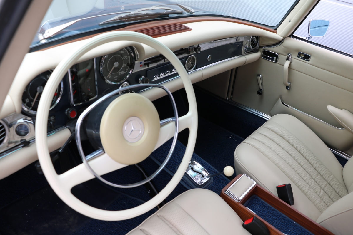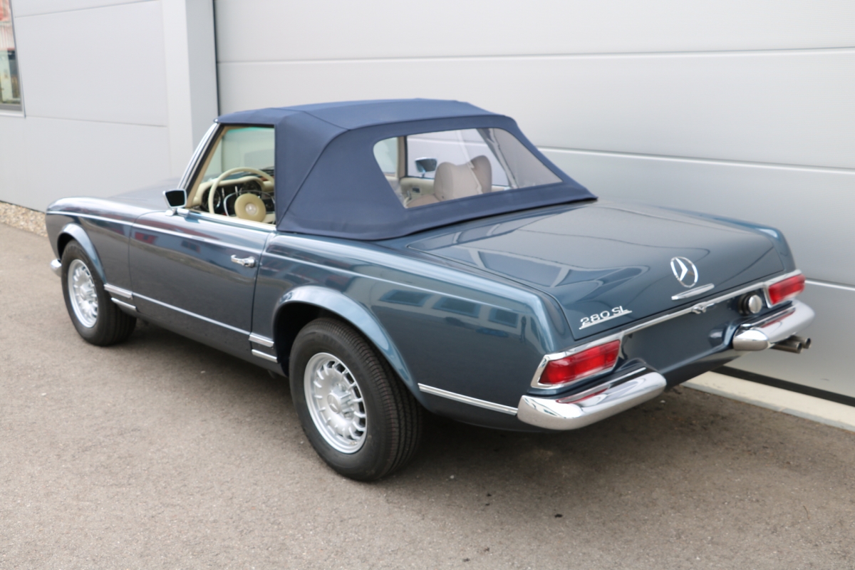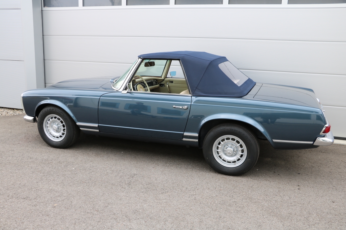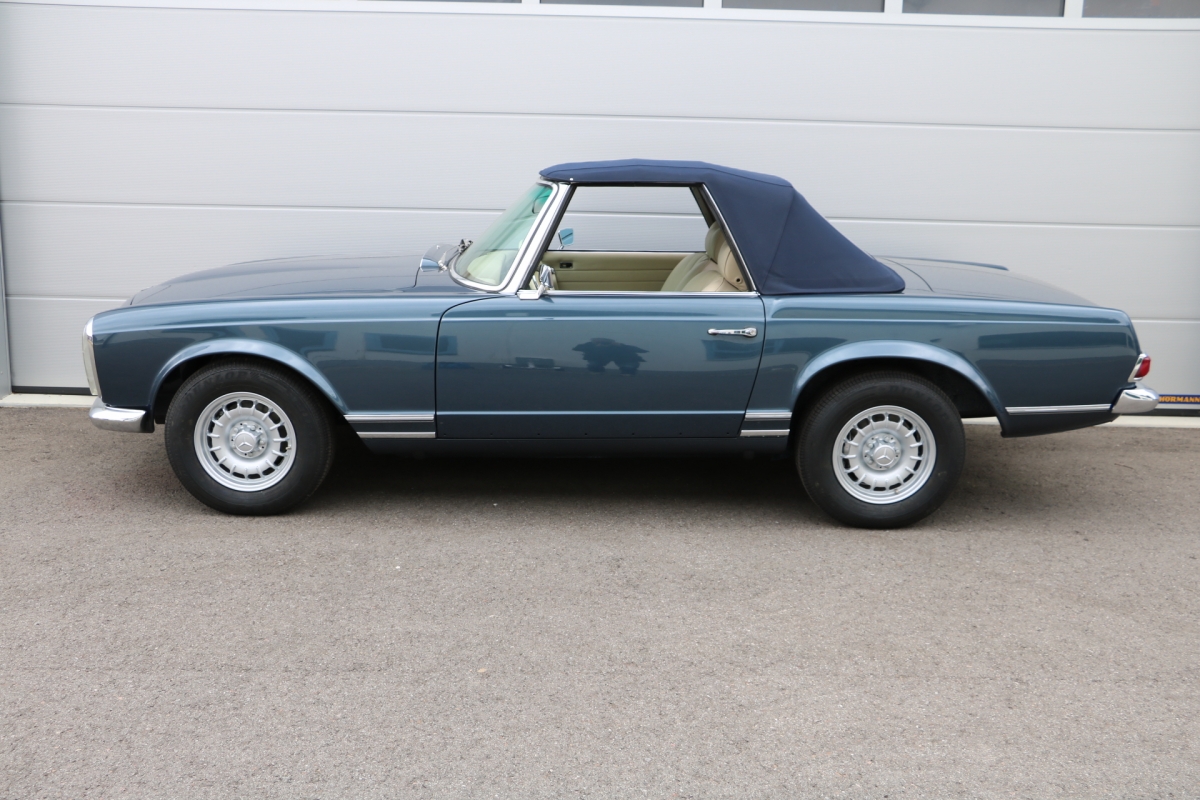 Anlässlich des Genfer Automobilsalons 1963, präsentierte Daimler-Benz den Mercedes-Benz 230 SL mit 150PS / 110kW in 3 Ausführungen: Als offenen Roadster mit sehr leicht bedienbarem Faltverdeck, als die bekannte Cabrio-Version mit Hardtop und zuletzt als Hardtop-Coupe, dem Verdeckkasten und Verdeck fehlten, dafür wurde zusätzlicher Stauraum für Gepäck geschaffen. Auch diese Variante konnte bei Abnahme des Hardtops offen gefahren werden. Als Sonderausstattung war für die Ablage im Fond ein Quersitz erhältlich. Später folgte noch die s.g. "California- Ausführung" mit Fondsitzbank, ebenfalls ohne Verdeck / Verdeckkasten. Ausser dem Viergang-Schaltgetriebe konnte auch erstmals bei einem SL ein Viergang-Automatikgetriebe geordert werden. Ab Mai 1966 stand zusätzlich ein ZF-Fünfgang- Schaltgetriebe gegen Aufpreis zur Verfügung. Dem konkav gewölbten Hardtop verdankt der SL seinen Spitznamen "Pagode". Im Februar 1967 präsentierte Mercedes-Benz den 250SL. Die Änderungen betrafen im Wesentlichen den Motor und die Bremsanlage. Identische Pferdestärken, aber ein Plus an Hubraum und Drehmoment: + 190 cm³ /+20 Nm, was sich sehr positiv auf den Laufkomfort auswirkte. Nach 5.196 gebauten 250 SL, präsentierte Mercedes-Benz 1968 den 280 SL: 170Ps / 125kW, 240 Nm. 23.885 Pagoden mit dem 2,8 Liter Motor wurden gebaut und eine davon, präsentiert sich hier, aufwändig, fachkundig und detailgetreu restauriert und mit CLASSIC DATA GUTACHTEN, Note 1!