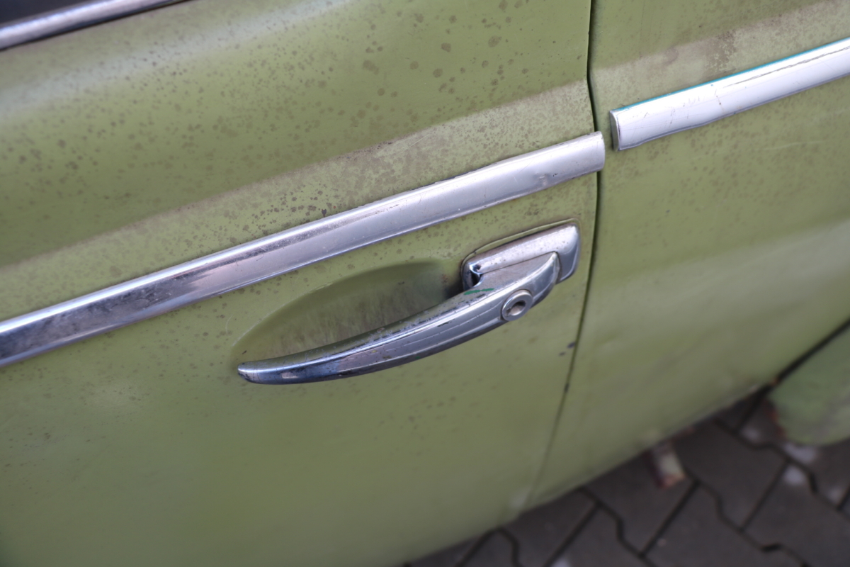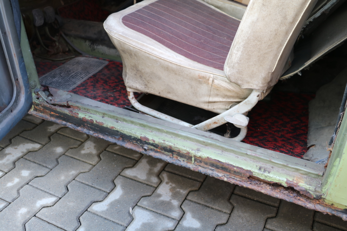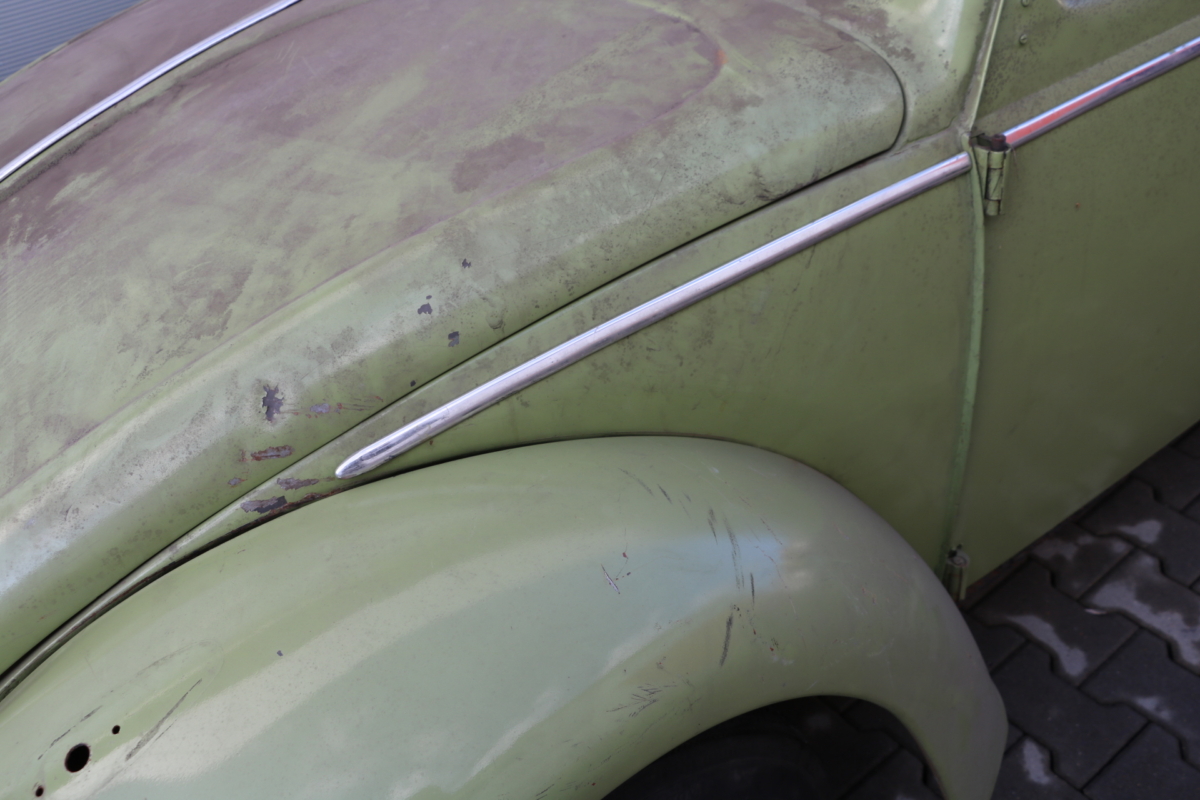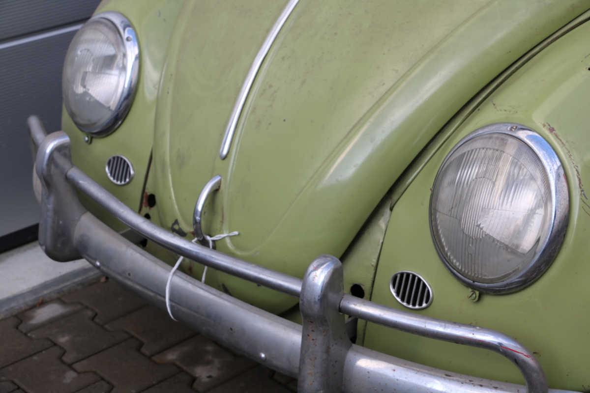 Dieser VW Käfer 1.200 Ovali mit Faltdach wurde anhand des im original vorliegenden PAPP-BRIEFES am 24. Mai 1957 fertiggestellt und an das Wuppertaler Autohaus Zeisler (heute Gottfried Schultz) geliefert. Am 31. Mai 1957 erfolgte die Zulassung auf die Firma Otto Rüschau & Co. 3 Jahre später erwarb in eine Hausärztin aus Füssen im Allgäu. Hier wechselte der Käfer noch 4x den Besitzer, bis er 1982 endgültig abgemeldet wurde. 1999 erwarb ihn ein Karosseriebauer und Restaurator aus Kempten, der ihn 17 Jahre lang in seiner Halle trocken stehen hatte, was allerdings die davor entstandenen Rostschäden nicht ungeschehen machte. Dem Ruhestand nahe und der Motivation beraubt, den Ovali wieder auferstehen zu lassen, steht er nun zum Verkauf. Die Rücklichter stammen definitiv von einer späteren Baureihe, sind aber problemlos beschaffbar, ansonsten ist er original und alle Teile vollständig vorhanden. Erwähnenswert: Es handelt sich bei diesem Ovali um eine deutsche Erstauslieferung. Er hat Deutschland nie verlassen, die Fahrzeuggeschichte ist anhand des Papp-Briefes nachvollziehbar. Bei diesem Fahrzeug ist eine vollumfängliche Restauration unumgänglich! Fahrgestell- und Motornummer stimmen überein, die Geburtsurkunde wurde bei VW-CLASSIC beantragt.